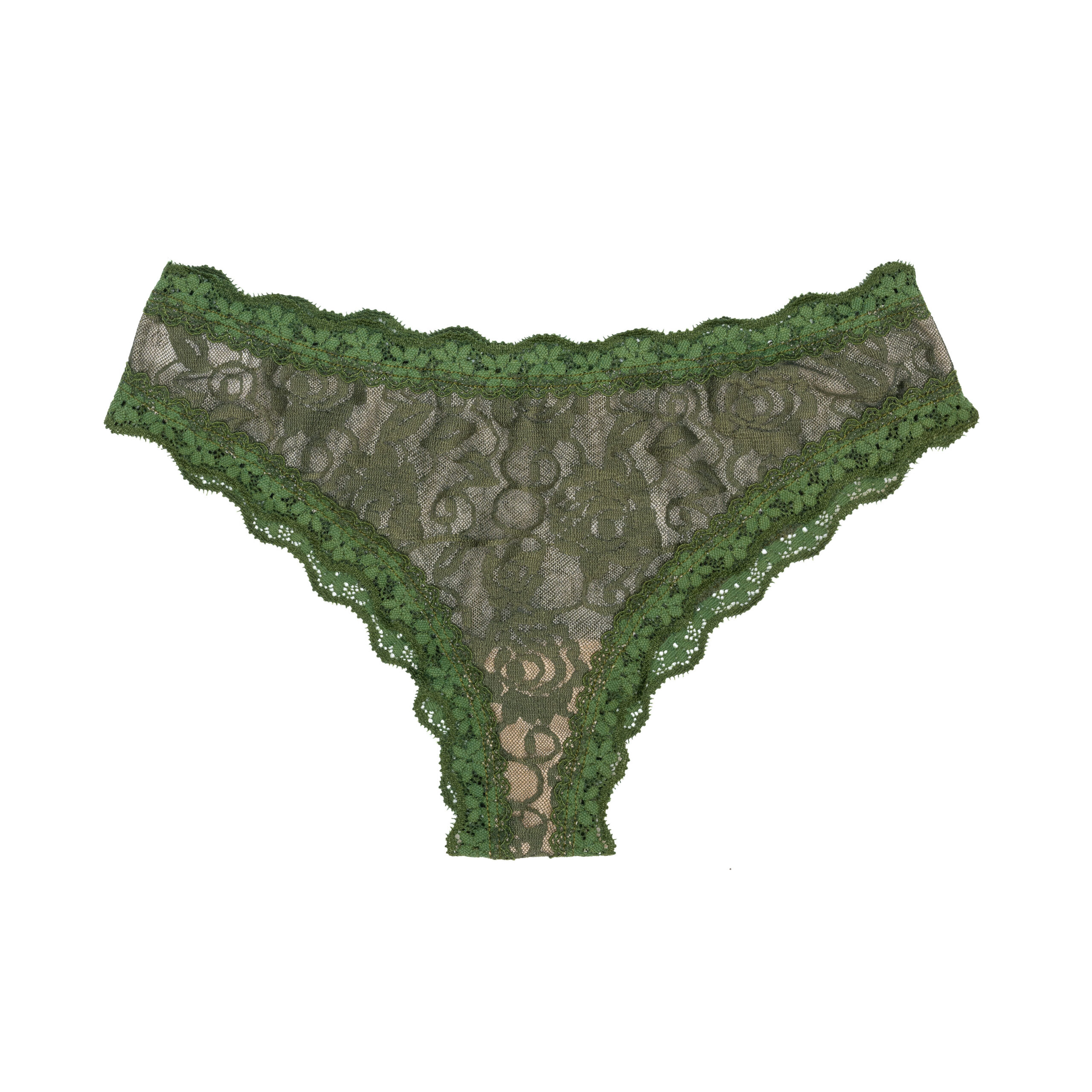 Cachetero en encaje elástico, sin costuras en piernas y cintura, forrado la parte delantera en tul. Refuerzo interior en algodón.